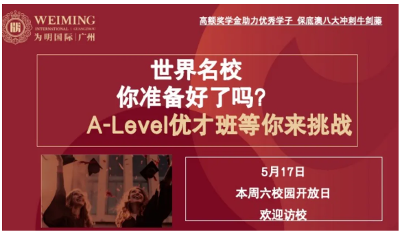 广州为明国际部在 10 年级开设 A-Level 优才班,以保底澳洲前三、冲刺英国G5、中国香港前四、加拿大新加坡顶尖名校为明确升学目标。