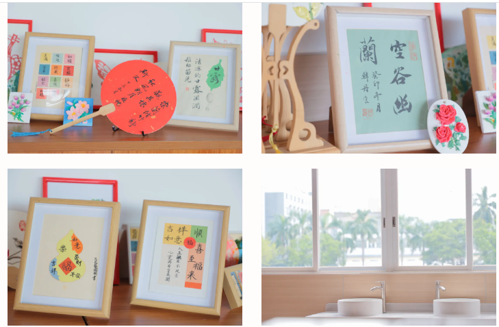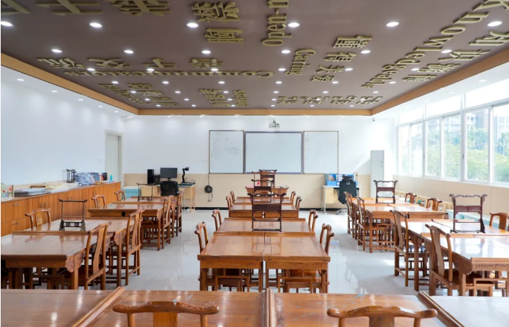 走进书法室,扑面而来的是淡淡的墨香。仿古实木书案整齐排列,文房四宝一应俱全。墙面装饰着小小书法家们的作品,营造出浓厚的文化氛围。在这个静谧空间里,每一笔每一划都是与传统文化的对话,等待着同学们来书写自己的翰墨年华。